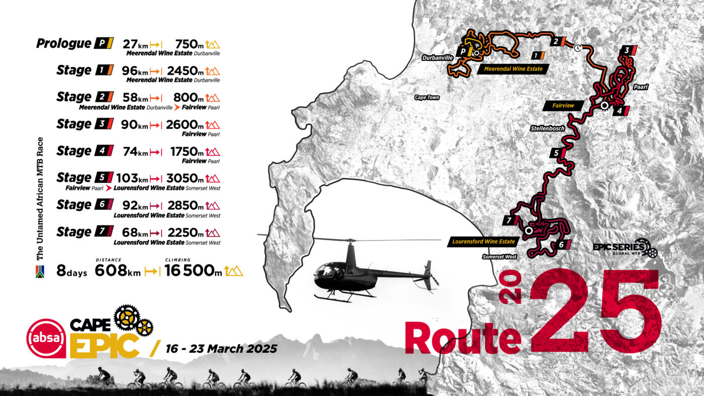 The 2025 Absa Cape Epic takes place from 16-23 March 2025 covering 608 kilometres with 16 500 meters of climbing