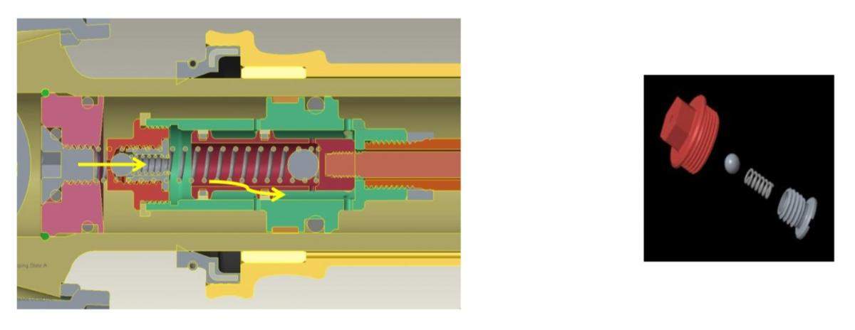 When pressure above the Piston is much greater than pressure below the piston, the Pressure Relief Valve will open. Oil will flow through a small port in the Spool Valve to balance the system.