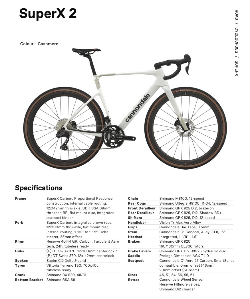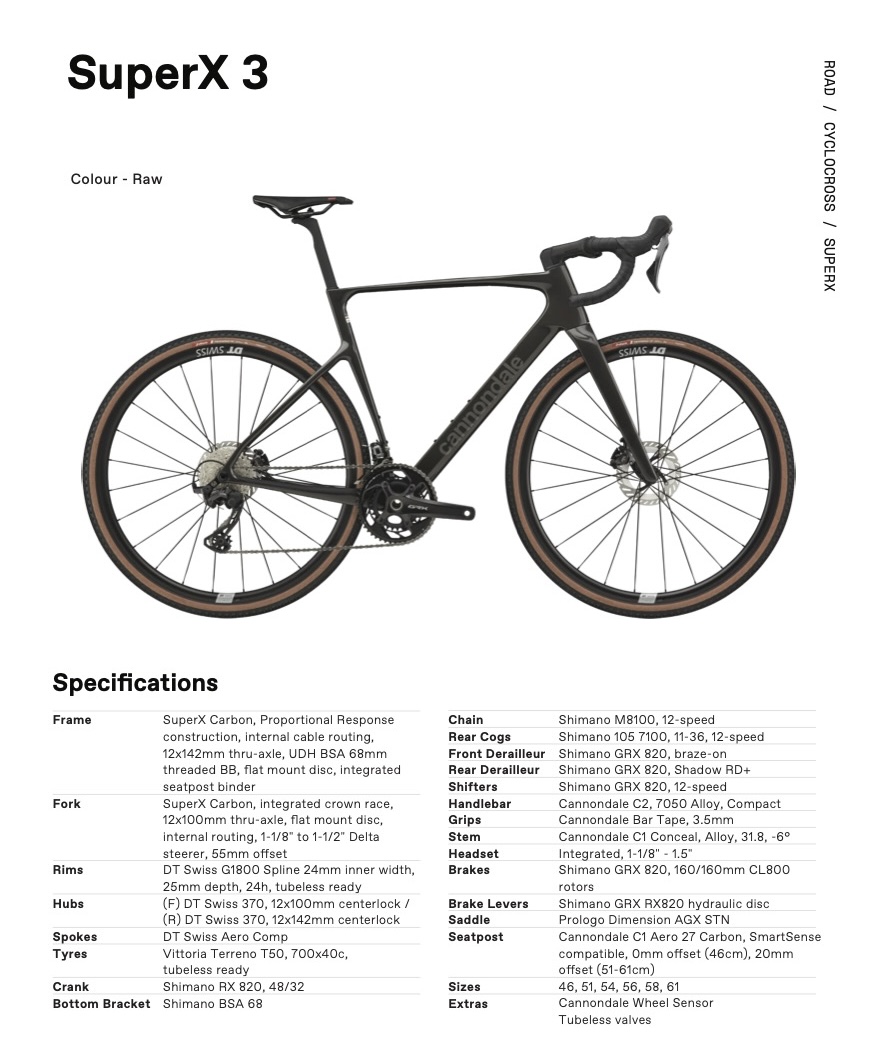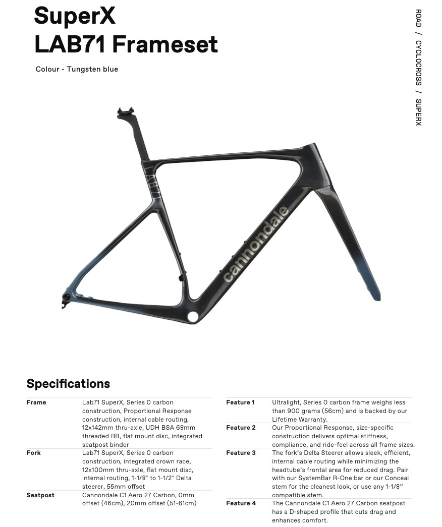 With Cannondale’s rider-focused design philosophy, Proportional Response, every rider can experience the full potential of SuperX. Fully customised by size, with different tube profiles and precisely oriented layers of different types and moduli of carbon, each frame provides an ideal balance of weight, stiffness and durability, optimised for each of the six sizes (46 thru 61cm). The new SuperX lineup comes in three spec levels as standard, plus a limited run of LAB71 complete bikes and framesets.