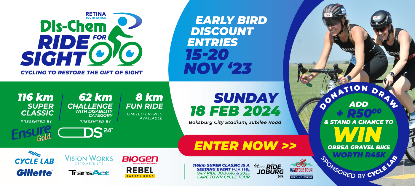 Join us for the Dis-Chem Ride for Sight taking place on Sunday, 18 February 2024 at City Stadium, Jubilee Road, Boksburg. There will be three distances to choose from: the 116km Super Classic presented by Ensure; the 62km DS 24 Challenge and a new 8km fun ride.