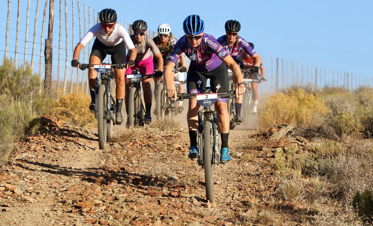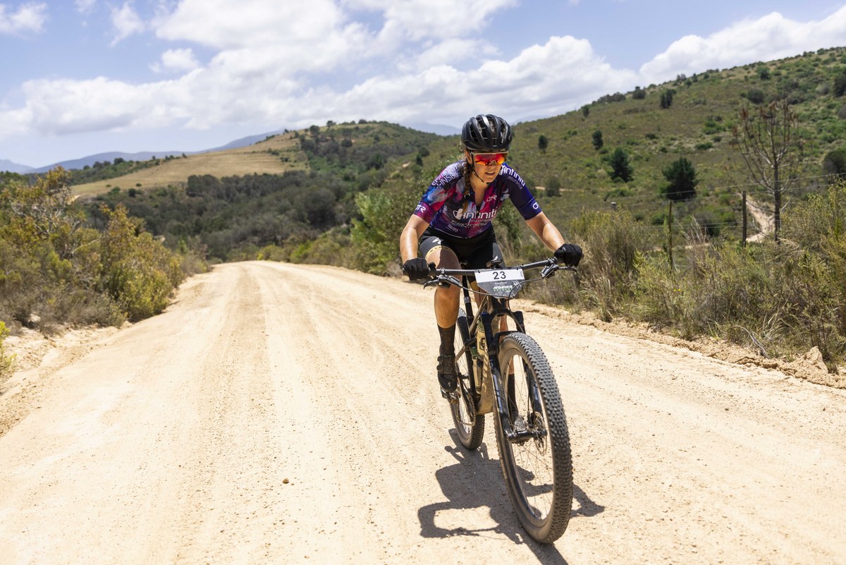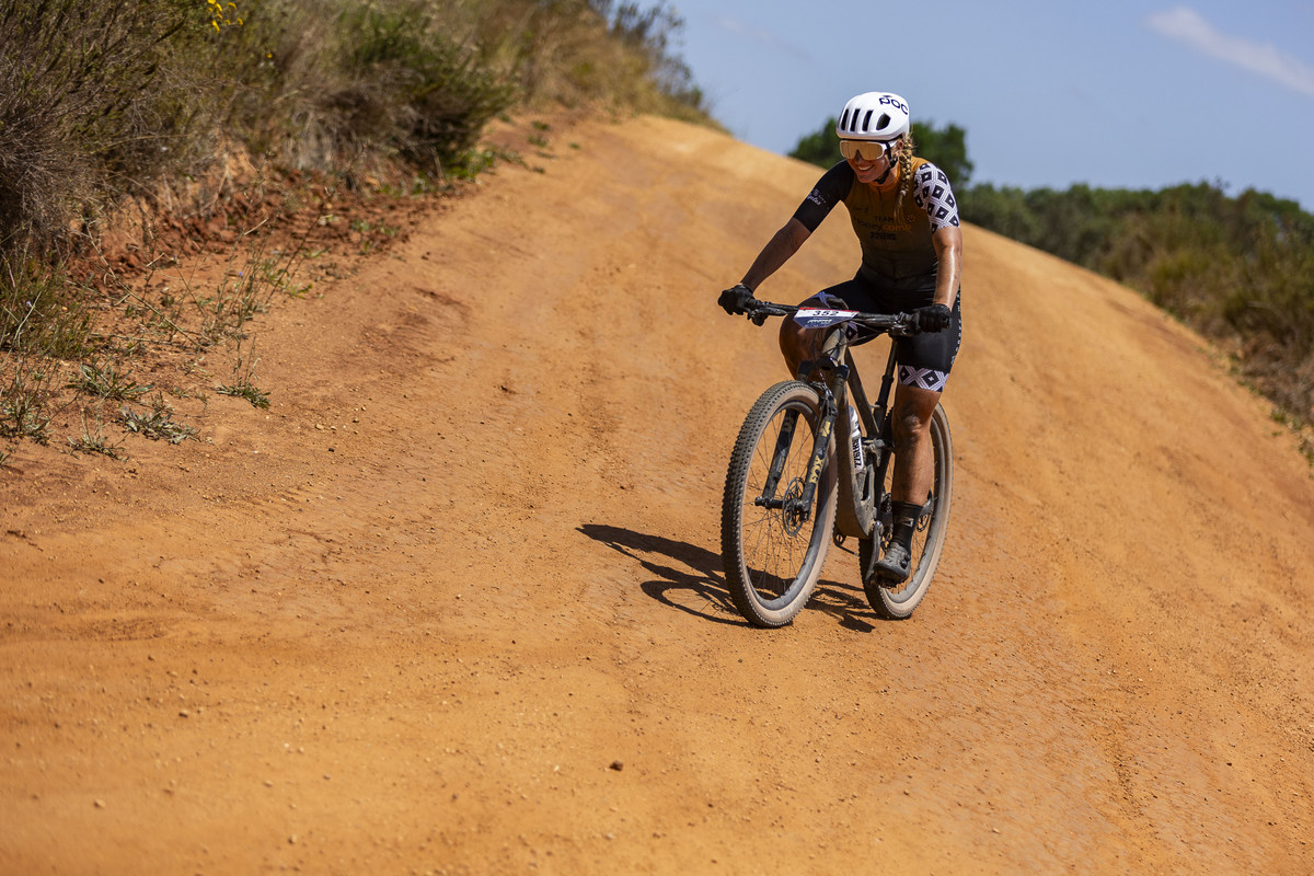 In the women’s race a steady start helped Sanders when she suffered her mechanical. “After that rocky climb I must have clipped a rock up and it knocked my AXS battery out,” Sanders sighed. “Fortunately, my friend Elrika Harmzen-Pretorius, gave me her spare and I was able to chase back and catch the lead group by Water Point 2. Then on the climb to the QOM Hayley [Preen] pushed on and I followed her until she eased off slightly, then I carried on to claim the hotspot prize. At the summit I made the decision to just keep going and if Hayley caught me, she caught me.”