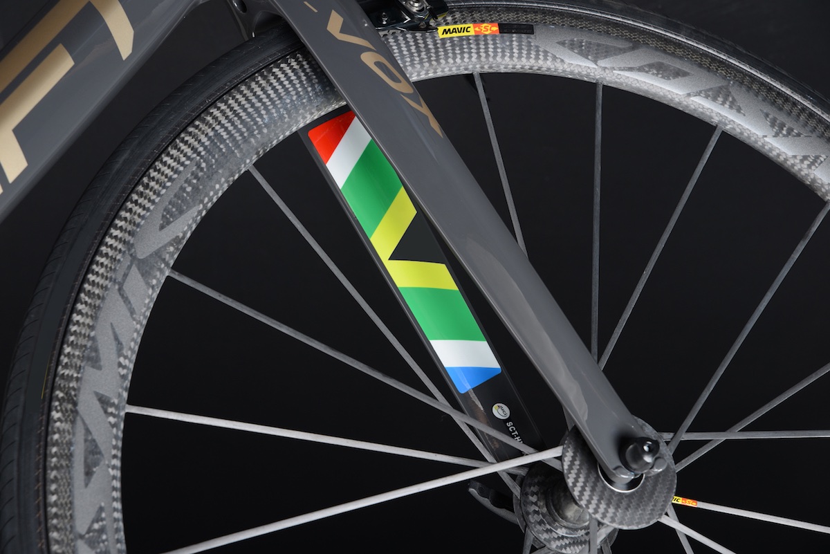 On Wednesday night he spoke about his and SwiftCarbon’s partnership over the last year, “I have really enjoyed working with the guys. It’s really great that I can give feedback on the bikes and it finds its way into future versions of the models that anyone can ride.” Schoeman gets a special touch to his rig for the upcoming season – a custom paint scheme featuring his HS logo, bronze decals and national flag detailing on the seat stays and fork blades. “The frame is production standard, but the design is special: to commemorate his big successes in 2016 and for Henri to represent his nation proudly with a cool looking bike,” says founder Mark Blewett, himself a South African.