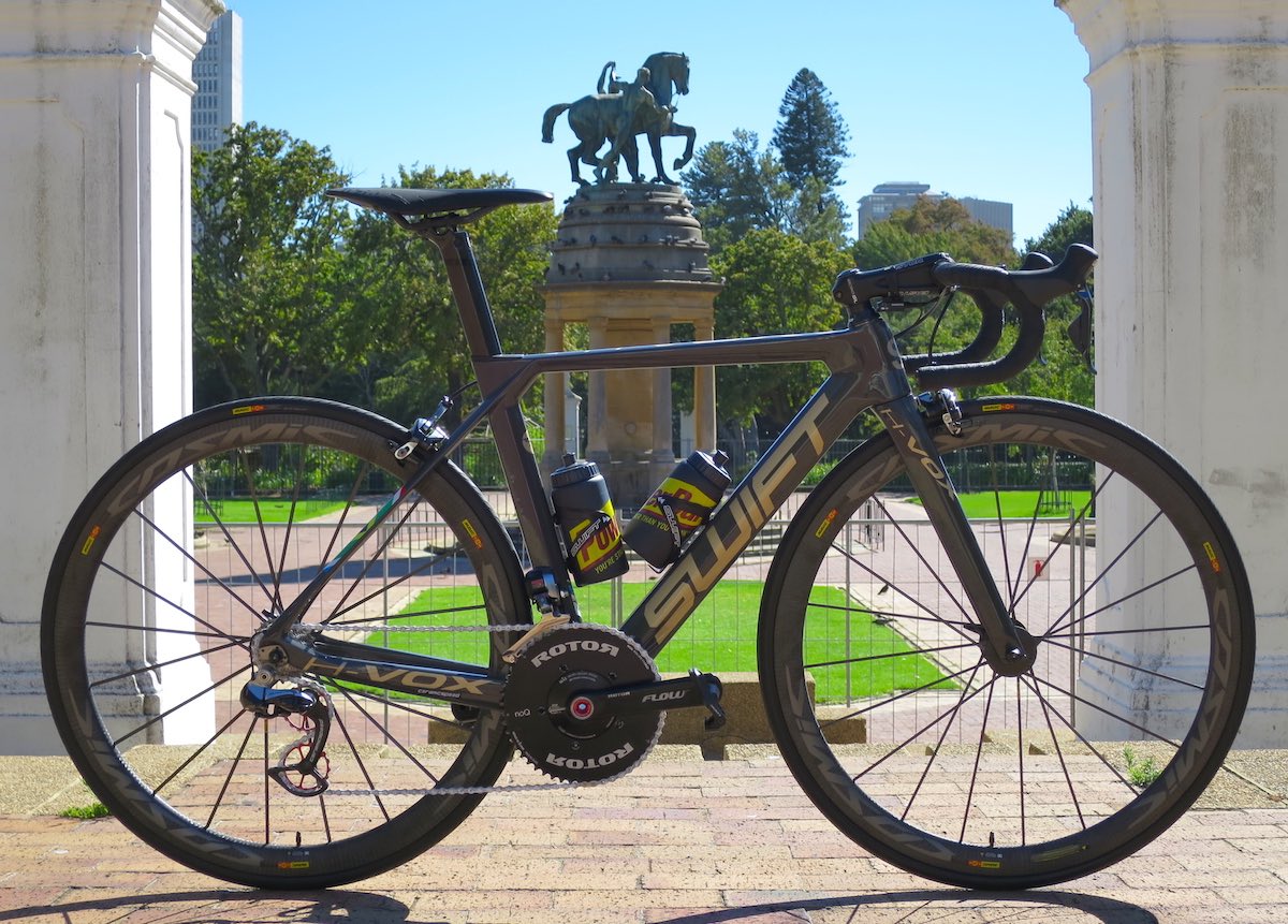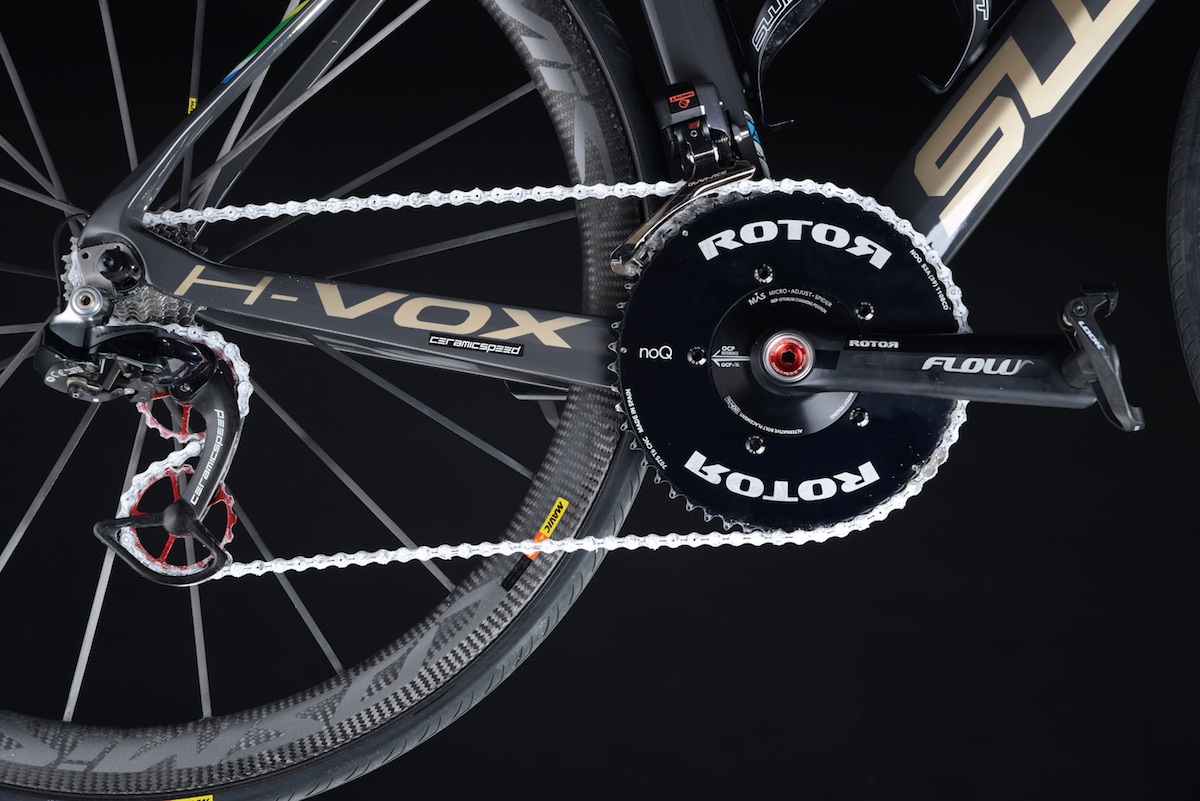 At the heart of Schoeman’s new rig is SwiftCarbon’s range-topping Hypervox frame featuring a Toray and Mitsubishi-Rayon composite matrix, tuned to be rigid around the head tube and BB area and compliant at the rear seat stays. Parts spec includes Shimano Dura Ace Di2 with Rotor cranks, Mavic wheels, Schwalbe tyres and some special CeramicSpeed parts and bearings. See full details below.