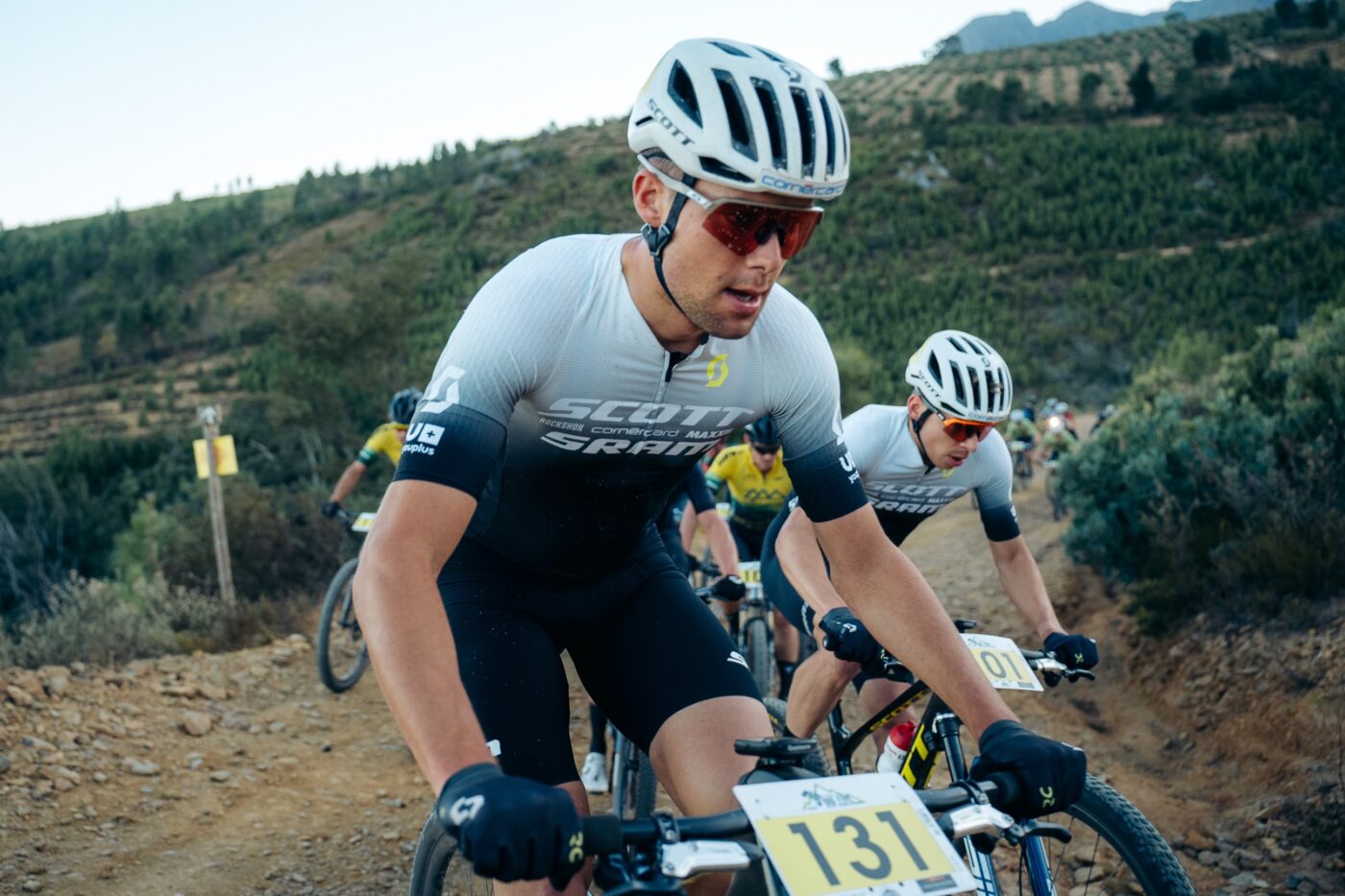 A breakaway group formed in the final punches of climb one and on the ripping descent that followed down to the Hawequa Scouts Hall at 20 km in. Marco Joubert was leading the charge with Andri Frischknecht, Filippo Colombo, Wessel Botha, and Alan Hatherly in tow. This group of 5 world-class riders would hold together until the monumental Obiekwa Ascent, marking halfway into the 80km race, upped the ante.
