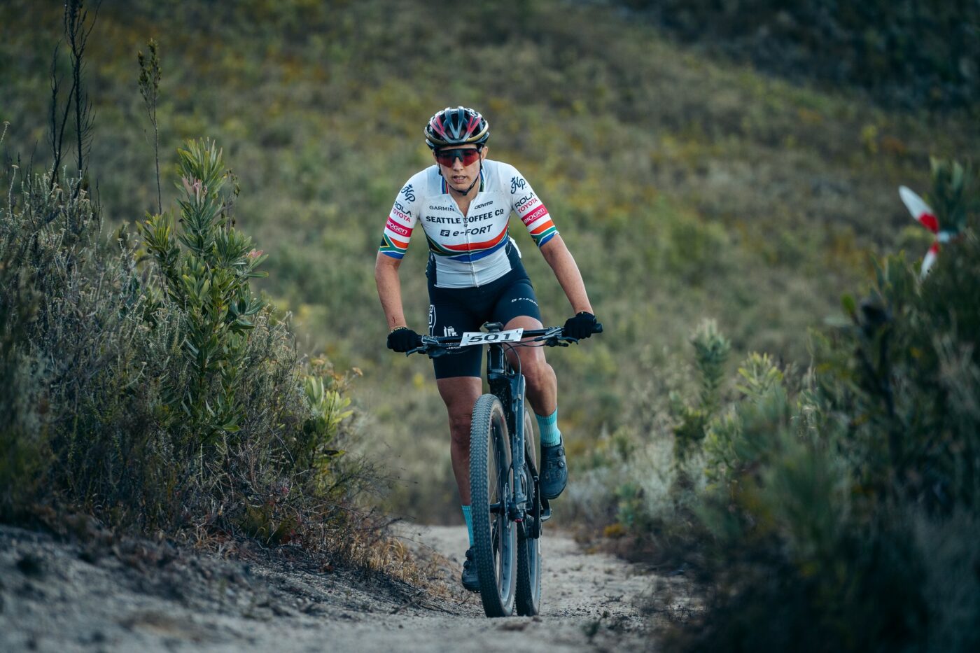 Descending technical trails and clawing their way up steep climbs, Candice Lill, (racing for Seattle Coffee co and Symbtech e-Fort) didn’t put a foot wrong and rode through to a repeat victory with a three-and-a-half minute gap to the 2nd placed Mitterwallner (representing Cannondale Factory Racing). Efficient Inifniti’s Vera Looser closed out the top 3, another 16 minutes behind 2nd. Danielle Strydom and Samantha Sanders rounded out the top 5.