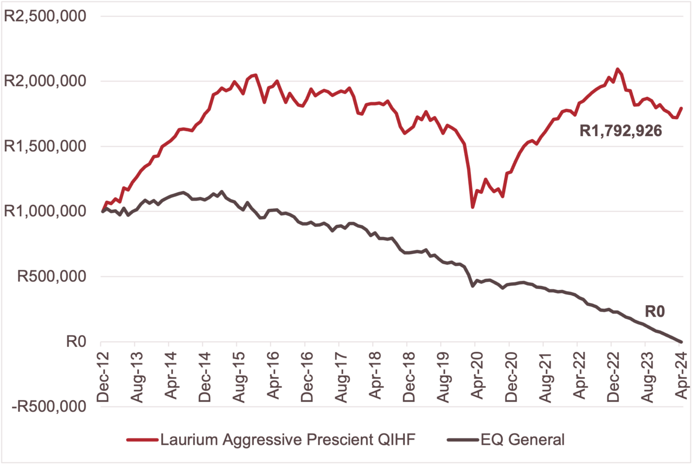 Better returns increase longevity of portfolios. In this scenario, we assume that R1 000 000 is invested on 1 Jan 2013 in the Laurium Aggressive Long Short Fund and the same sum invested in the average general equity fund. You then draw a monthly income of R8000, increasing at 6% per annum. After just over 10 years (30 April 2024), you would have zero left if you had invested in the average general equity fund, but if you had invested in the Laurium Aggressive Long Short Fund, you would still have R1 792 926 invested.