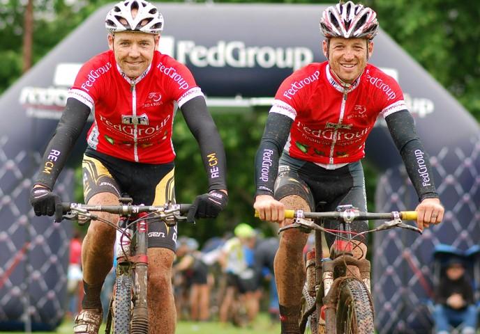 Team RE:CM’s Neil MacDonald (left) and FedGroup ITEC Connect’s Brandon Stewart, wearing the red jerseys of race leaders, were all smiles after winning the overall title at the 2012 FedGroup Berg & Bush three-day mountain bike stage race at the weekend. The pair will team up officially from 1 January 2013 when MacDonald’s two-year contract begins.