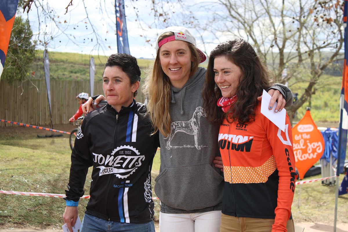 On the women’s podium at the aQuelle Tour de Krantz, the penultimate event in the Quattro ROAG Series, were (from left) Nathalie Bergstrom (2nd), Bianca Haw (1st) and Christie-Leigh Hearder (3rd). Ralph Schroder / Schroder Sports Photography