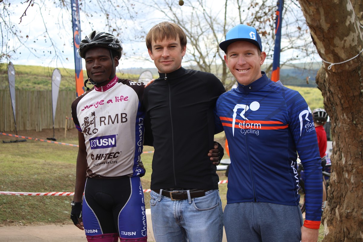 The men’s podium at the aQuelle Tour de Krantz, the penultimate event in the Quattro ROAG Series, featured (from left) Sthembiso Masango (3rd), Stuart Marais (1st) and Leeroy Emslie (2nd). Ralph Schroder / Schroder Sports Photography