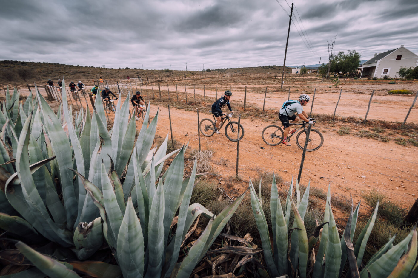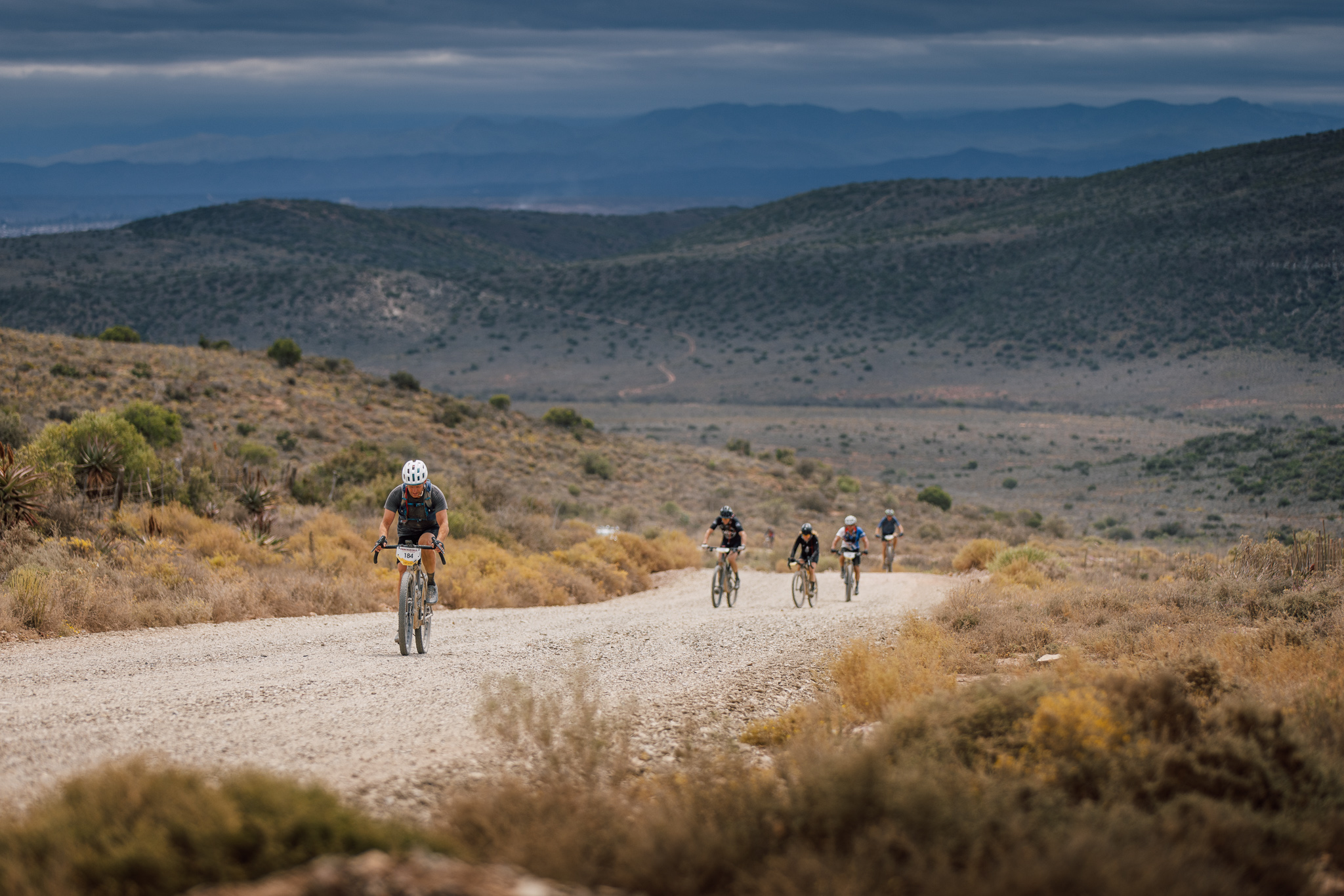 From there, the route carves through iconic Karoo landmarks including Matjiesvlei, Wildehondekloof, and Grundheim before reaching the halfway mark at Highgate Ostrich Show Farm near Oudtshoorn. Riders can expect fast stretches of hardpack gravel, interspersed with gentle undulations, and the kind of big-sky scenery that only the Karoo can deliver.