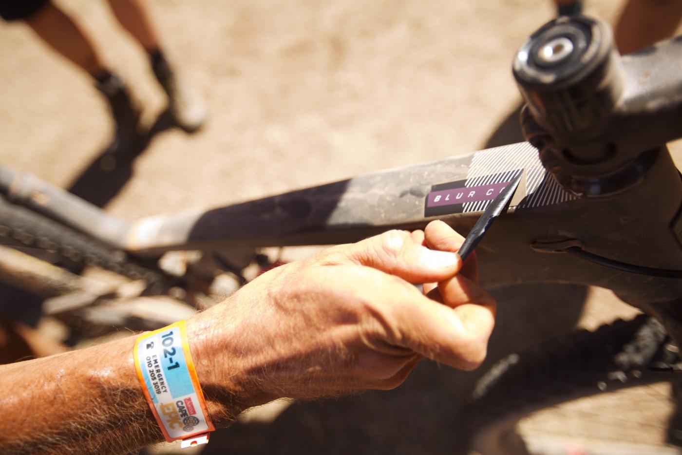 Amidst all the action, my highlight from today’s Stage 2 was peeling off the black tape to reveal a crisp, clean, off-white Santa Cruz down-tube logo … with Zone on my wheel and one of my oldest cycling mates – Gary Perkin – alongside to capture the moment.