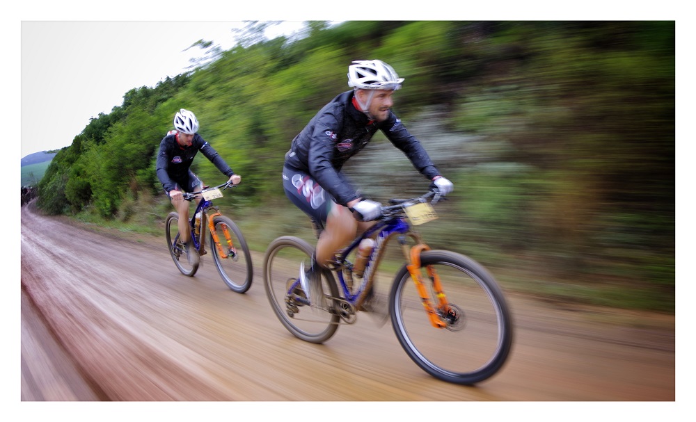 Ellsworth-ASG’s Pieter Seyffert (right) and Travis Walker continued to set the pace in the men’s team section on a muddy fourth stage from Riversdal to Swellendam in the TransCape mountain bike race. The seven-day, 690km journey from Knysna will end at La Couronne Wine Estate in Franschhoek on Saturday. Photo: Jacques Marais