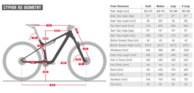 The Titan Racing Cypher’s geometry has been brought bang up to date for a more progressive ride. Headline numbers for the Cypher RS are 67° head angle, 75.5° seat tube angle, 435mm chainstay length, 337.5mm BB height and a reach of 470mm for a size large. (Numbers quoted above are for the “low” setting)