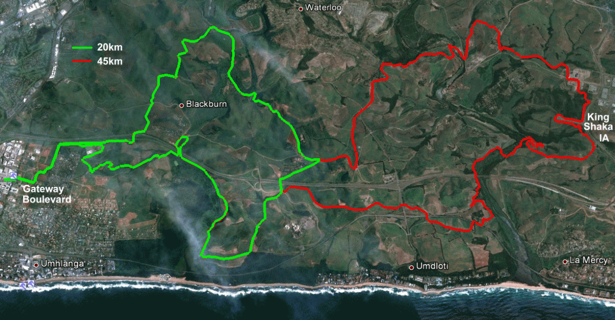 The 20km and 45km MTB routes for the aQuellé Tour Durban presented by Spur.