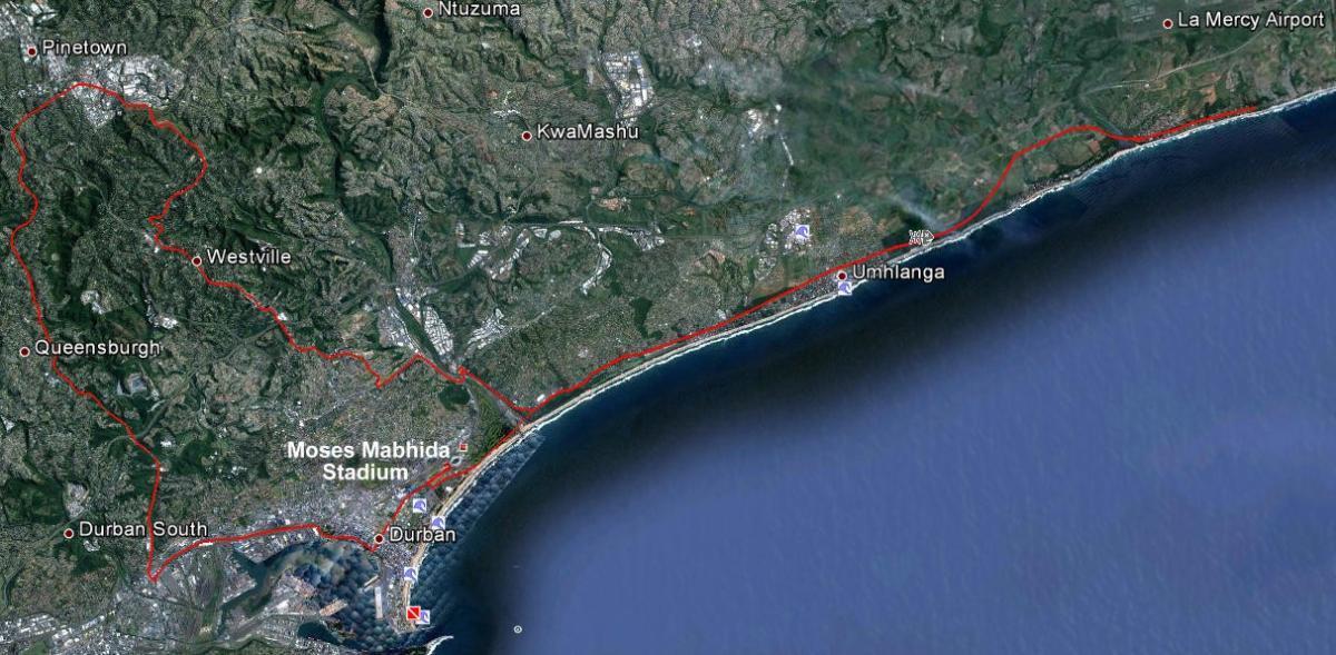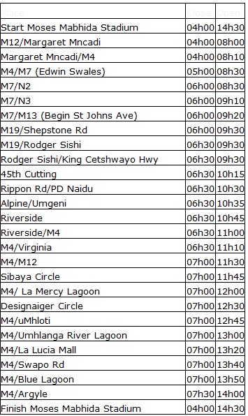 The 106km road race will use major roads and freeways such as the Victoria Embankment (Margaret Mncadi), the M4 Southern Freeway, the Edwin Swales Drive (M7) to Pinetown, Shepstone and Blair Atholl (Rodger Sishi) Roads , the M13 (King Cetshwayo highway), Umgeni road and the M4 coastal freeway to Ballito and back.