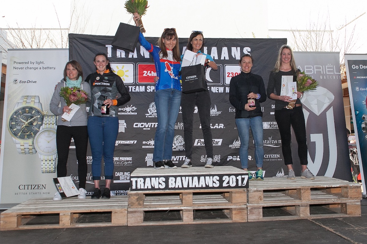 Ladies podium at The Repeat with winners KWP/Helderberg Cycle World – Anneke Viljoen & Alma Colyn, 2nd Lunachix with Bridgette Joubert & Tracey Cambell and in 3rd Loerine De Wit & Hanlie Cilliers.